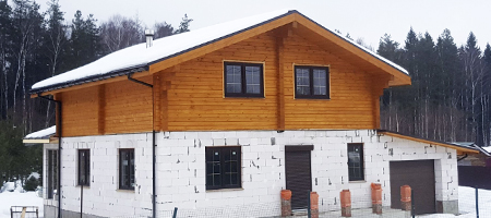 Резюмируя вышесказанное, мы внедрили в коллекцию наших проектов комбинированные дома. Мы решили совместить плюсы каменного и деревянного домостроения, что в сумме снизит их недостатки. Действительно, нагрузки на фундамент сократятся, а если использовать деревянное перекрытие (лаги 100*250 мм с шагом не более 590 мм), то мы получим существенную экономию процесса. На 1-м этаже можно разместить такие «огнеопасные» помещения как кухня, каминный зал, бойлерная, сауна, а также гараж, и это будет основательно и долговечно. А на 2-м – спальные комнаты, и здесь будет прекрасная атмосфера деревянного дома. К тому же, можно существенно сберечь дерево от влажной земли высотой и косых дождей большими свесами кровли.